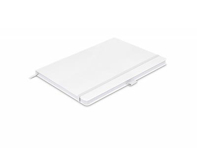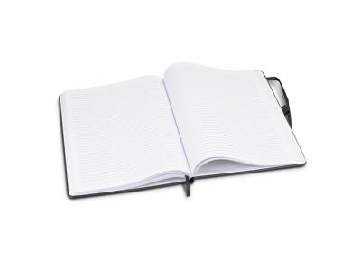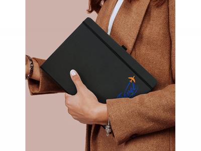 These large-size custom notebooks feature a hardcover with a smart PU finish and come with 96 sheets (192 pages) of 70gsm lined paper, a bookmark ribbon, an elastic closure band and an elastic pen loop.