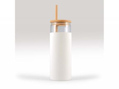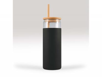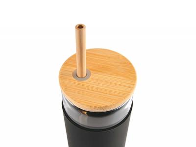 - 480ml borosilicate glass tumbler with sealed bamboo lid and straw.