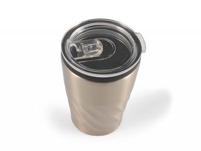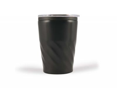 These custom branded 300ml double walled stainless steel cups have a black inner liner and are suitable for hot or cold drinks. They also feature a splashproof sliding closure and the base has a foam surface protector.