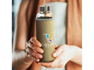 Incorporate branded hayley glass drink bottles with natural sleeve (600ml) in your next promotional campaign