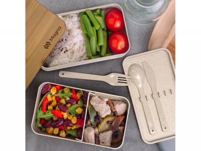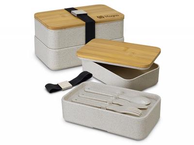 These eco-inspired 1000ml stackable lunchboxes are manufactured from a unique 50/50 blend of natural wheat straw fibre and BPA-free polypropylene. They include a cutlery set, a separator and have a bamboo push on lid that is held securely in place with an elastic band.