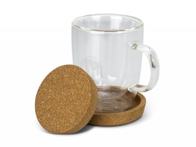 Incorporate branded glass coffee cups with cork lid coaster (350ml) in your next promotional campaign