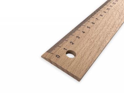 This 20cm ruler is made of beech wood and features centimetre markings printed in black ink. Due to the natural properties of the wood, there may be variations in the grain pattern, color, and branding. The ruler also includes a hole on one end, allowing it to be easily hung on a wall. One side of the ruler is marked with centimetre graduations for easy measuring.