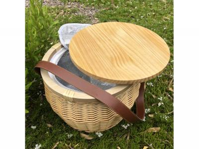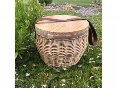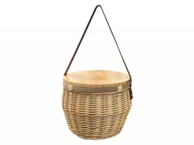 This is a round-shaped wicker basket, handmade and perfect for picnics and parties. The basket comes with an insulated silver lining on the inside and a zippered canvas closure, which helps keep food and drinks cool. The basket also features a lacquered pine wood lid that can be used as a small table for food and drinks, but it's not recommended as a cheese board. Each board is unique, and no two boards will have the same markings. The basket also comes with a high-quality, thick, and comfortable leather shoulder strap that makes it easy to carry around. Because the basket is handmade, its size and shape may vary slightly, and there may be some minor imperfections.