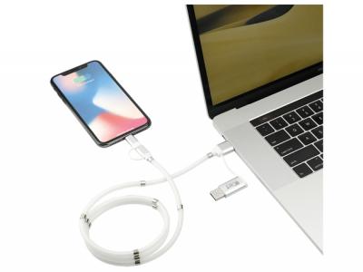 The Whirl 5-in-1 Charging Cable with Magnetic Wrap is a versatile charging solution that is compatible with a wide range of devices. With its magnetic wrap feature, you can easily store and organize the cords for a neat and tidy setup. On one end, it features a USB-A tip and Type-C Input adapter. On the other end, there's a 2-in-1 dual-compatible tip for both iOS and Android devices, as well as a Type-C output adapter. Not only does it allow you to charge your devices, but it also supports data transfer. This charging cable is perfect for people who are always on the go, as it offers a convenient and efficient way to charge and transfer data.