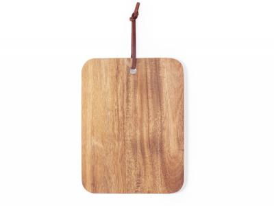 This cutting and presentation board is made of natural wood and comes in a rectangular format. It includes a matching cord made of durable PU leather for easy handling and storage.