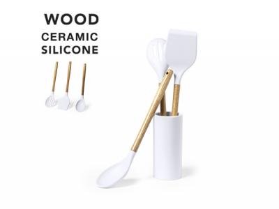 This 3 piece kitchen set includes a spoon, palette, and skimmer, each with a handle made of natural acacia wood and silicone accessories. It comes with a matching ceramic base and is presented in an individual box with a kraft design.