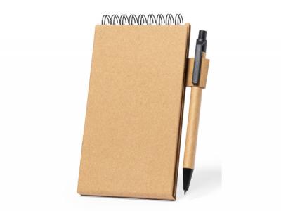 This is a notepad made from recycled cardboard that can also be used as a smartphone holder. It includes a ring notepad with 30 white sheets and a single-stripe layout, as well as a pen holder. Additionally, it comes with a recycled cardboard ball pen that has black details, a push button mechanism, and blue ink. There are also 25 medium-sized sticky notes and 125 mini sticky notes in various colors. The package contains a total of 30 sheets for the notepad, 25 sticky notes that measure 7.5 cm x 7.5 cm, and 125 mini sticky notes that measure 1.2 cm x 4.5 cm.
