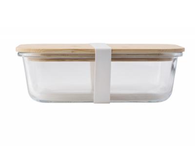 A lunch box made of glass, featuring a bamboo lid and a silicone strap. It has an approximate capacity of 900 ml.
