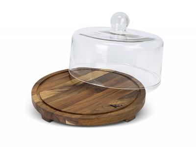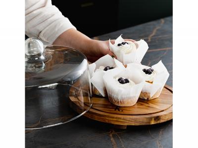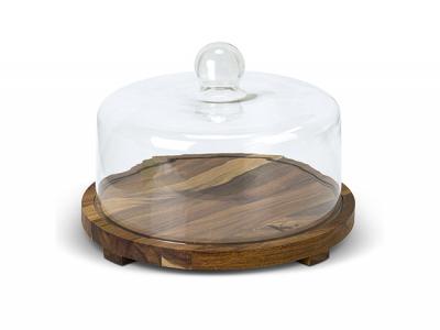 An exquisite cake showcase featuring a 27cm glass dome paired with a 29cm base made from natural acacia wood. This elegant display is meticulously packaged in a natural gift box adorned with a Keepsake branded sleeve.