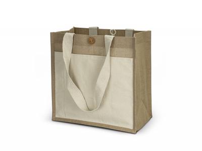 Stylish custom jute tote bags crafted from 290gsm jute fabric. This custom tote bag features a large gusset and a charming wooden button closure. It's not only fashionable but also practical with a 290gsm unbleached cotton slip pocket for added convenience. The long woven cotton carry handles make it easy to carry your essentials in style.