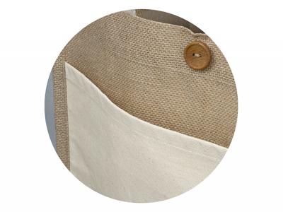 - Materials: Body: Jute, Pocket: Cotton, Handles: Cotton, Button: Beechwood