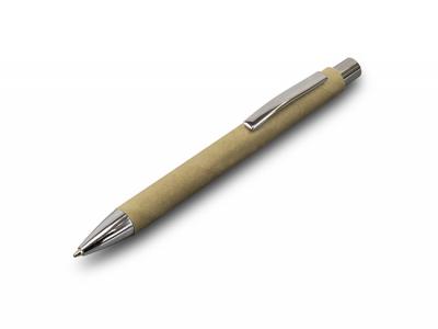 Custom retractable ballpoint pen featuring a eco-friendly kraft paper barrel and shiny chrome trim. It's equipped with a black large volume refill containing 1200 meters of high-quality German manufactured Dokumental ink. A stylish, sustainable writing instrument for all your needs.