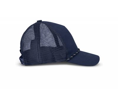 Our structured five-panel custom caps, crafted from 100% cotton twill with a breathable mesh back in a classic trucker style. Complete with a curved peak, matching button, and decorative cord detailing, this cap offers both style and functionality. Additional features include a sweatband for comfort and an adjustable snap back closure, ensuring a perfect fit for most wearers.