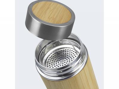 This attractive 500ml custom water bottle boasts double-wall vacuum insulation, ensuring your beverages stay hot or cold for extended periods. Made from durable stainless steel with a natural bamboo outer, it combines robustness with eco-friendly style. The secure screw-on lid prevents leaks, making it perfect for on-the-go use. Additionally, the branded water bottle includes a removable tea infuser and strainer, ideal for brewing teas or infusing water with fruits and herbs. Presented in natural packaging with NATURA branding, this custom water bottle makes a great gift and a practical accessory for everyday use.