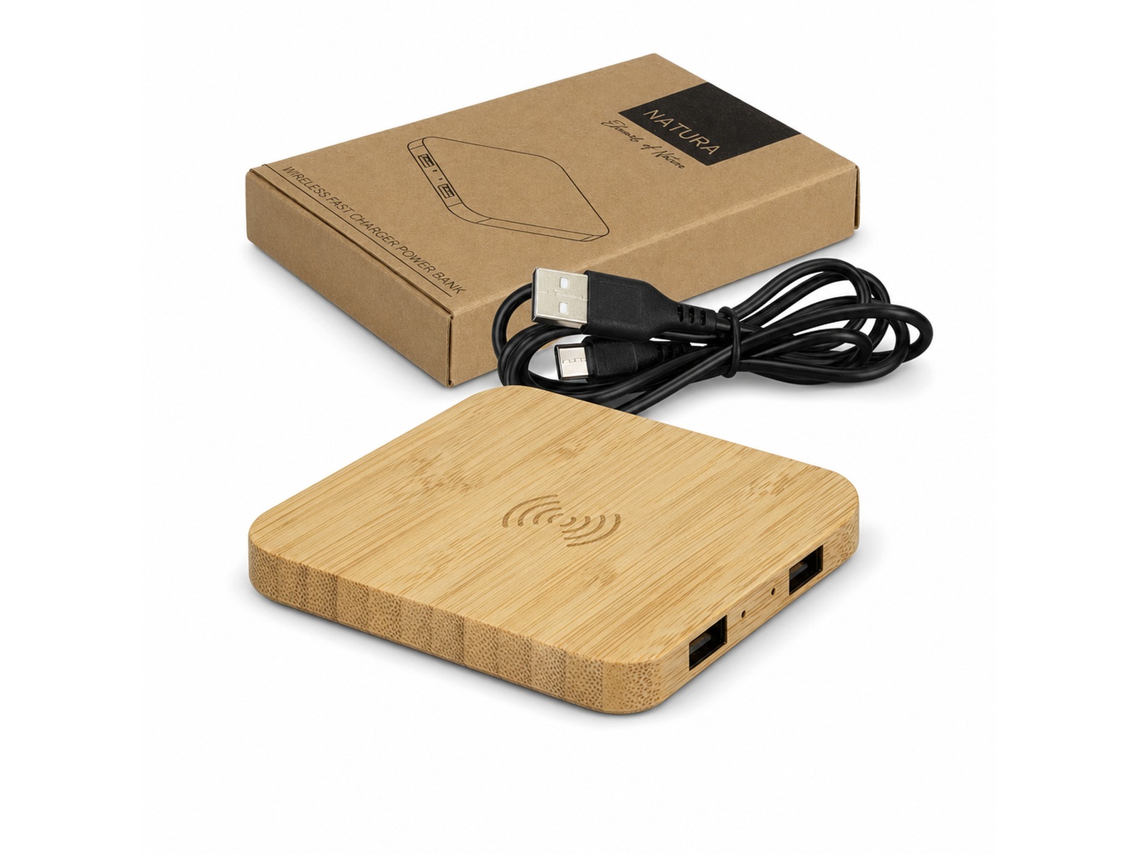 This versatile 15W custom wireless charger allows you to charge up to three devices simultaneously, ensuring maximum efficiency and convenience. The custom charger features fast wireless charging for compatible devices, easily enabled when used with a 20W+ Quick Charge or Power Delivery mains adaptor. In addition to wireless charging, the hub includes twin USB-A ports for conventional charging, providing flexibility for various devices. The natural bamboo casing adds an eco-friendly and stylish touch to the charger. The hub is presented in a natural gift box with NATURA branding, making it an ideal gift option.