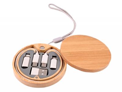 A chic, eco-friendly charging solution crafted with natural bamboo and wheat straw accents. This round bamboo charging cable sets features a magnetic lid that slides open effortlessly, revealing the essential charging components inside. A grey braided carry strap adds convenience and style. Beneath the lid, you'll find a Type C to Type C cable, along with Type A, Micro USB, and iOS connectors, ensuring compatibility with a wide range of devices. Both the cable and connectors are made from environmentally friendly wheat straw, and a grey insert in the base keeps everything securely in place. The charging Cable Sets combines functionality with sustainability, making it the perfect accessory for the eco-conscious tech enthusiast.
