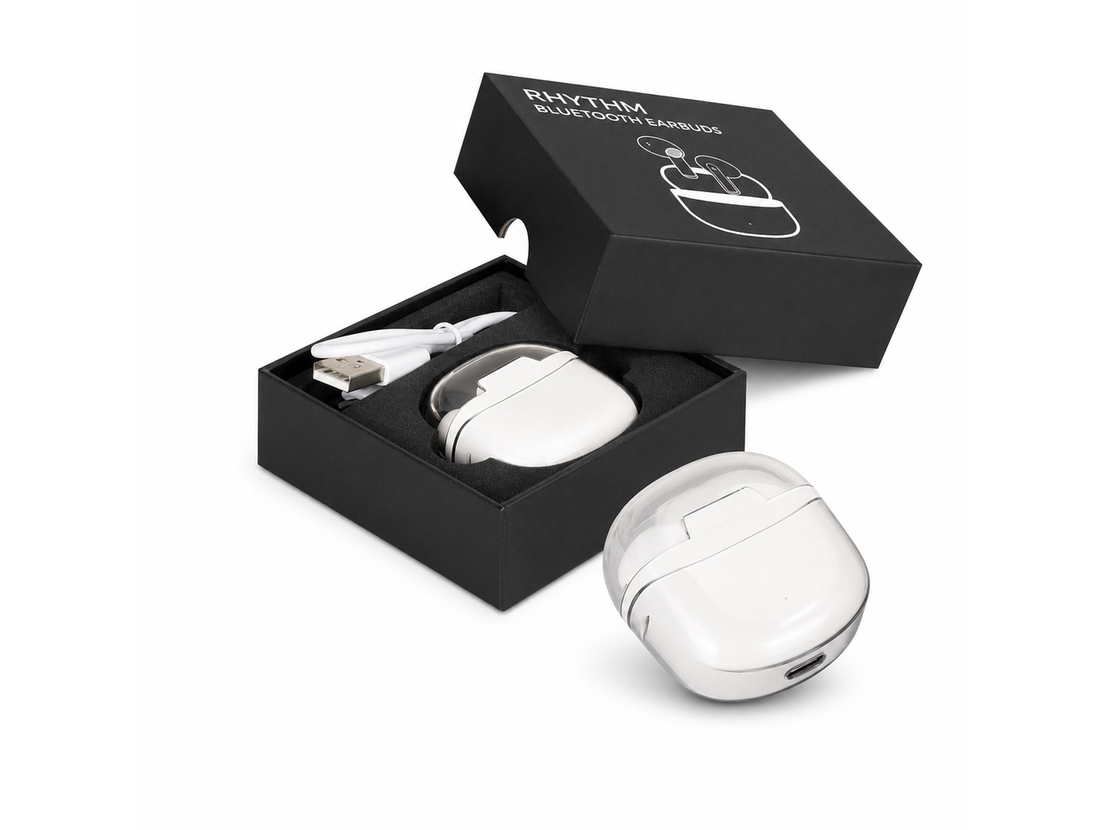 Our Bluetooth Earbuds deliver crystal-clear sound in a compact, rechargeable design. These wireless earbuds come with a convenient charging case that provides extended battery life for all-day use. The Type-C charging capability ensures quick power-ups, while the built-in controls make it easy to manage your music and calls. Each set is beautifully presented in a branded black gift box, perfect for making a lasting impression.