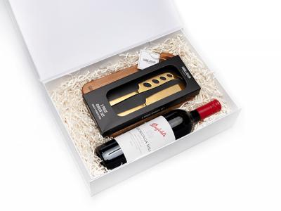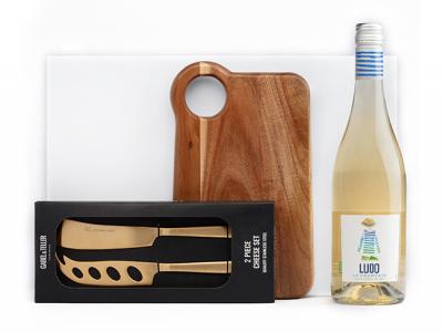 The Wine and Cheese Board Gift Sets features a Gabel & Teller acacia wood serving board, luxe gold cheese knife duo, and your choice of premium red or white wine. Packaged in a white magnetic-close gift box with soft vanilla cream shred and finished with a custom digital sleeve.