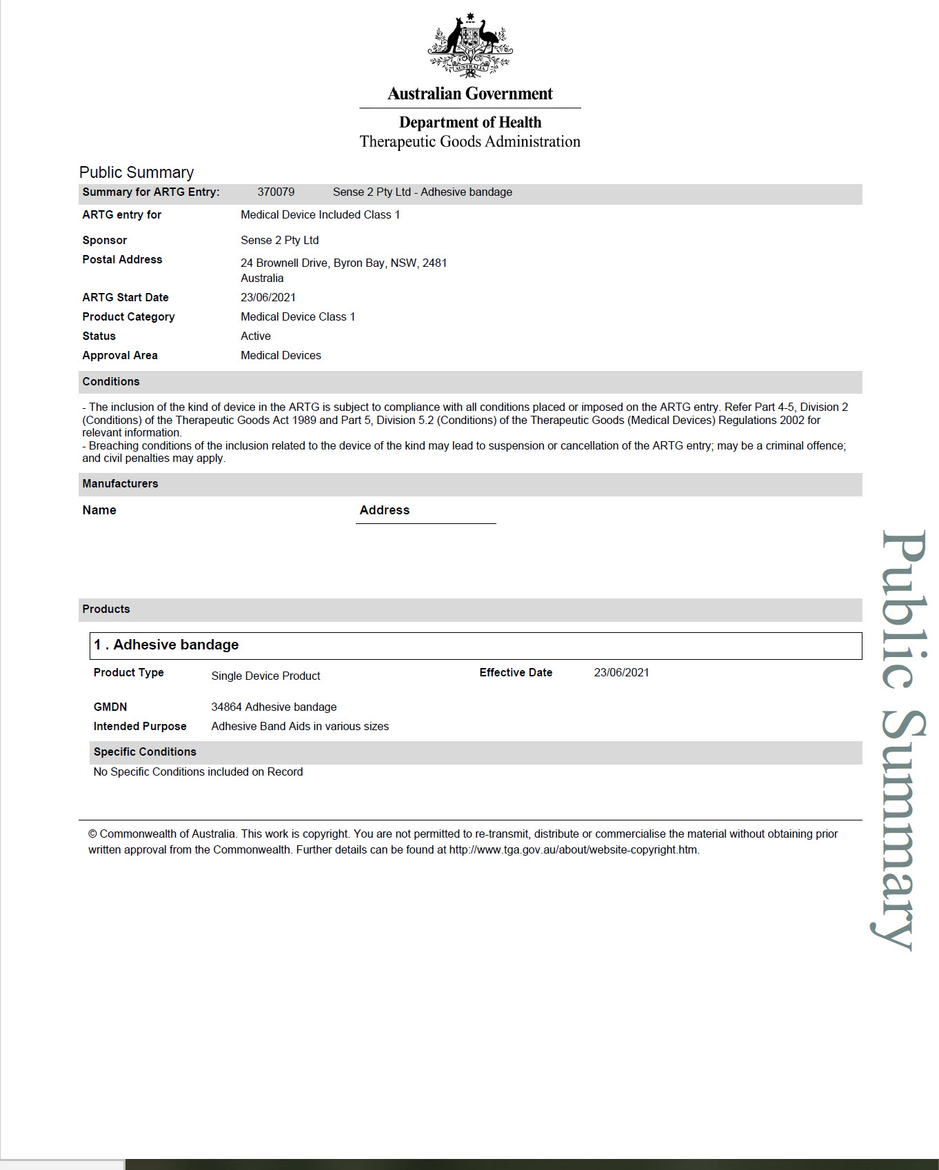 Bandaids are entered in the Australian Registry of Therapeutic Goods ARTG 370079
