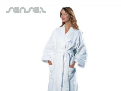 Waffle weave custom bathrobe has your custom logo embroidery on them. Promotional Waffle Bathrobes are a fabulous medium to use to promote any Travel or Beauty-related brand. Custom Bathrobes are a premium quality product that will go a mile. These custom bathrobes will be a fun addition to any successful marketing campaign, and will leave every customer relaxed and rested. Waffle Kimono Bathrobe - Kimono styling for both men and women. One size fits all. Two pockets and belt with belt loops.
