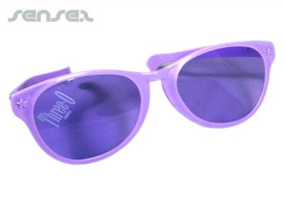 Custom printed and custom made Oversized dress up sunglasses in your choice of plastic frame colour printed with your logo either on the arms or the lense. These fun clown sunglasses make a great crowd impact at large events. Cost shown includes 1 colour print on arm or lens. We can do these clown sunglasses also in other shapes such as round, star, or 50s style.