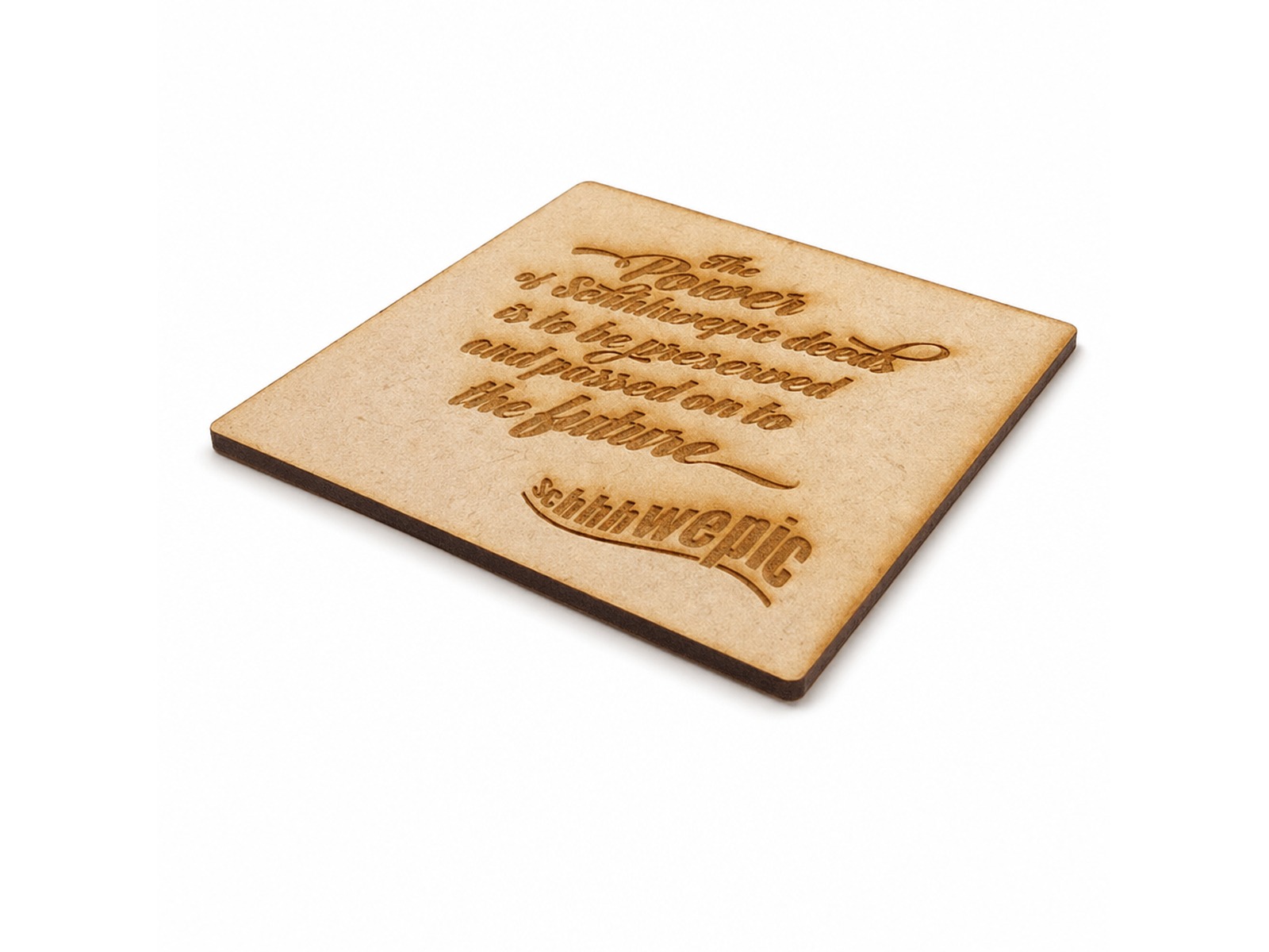 Wooden coasters in either round or square shape can be custom engraved with your logo for a burnt environmentally friendly coaster give away. We can also laser cut them to your custom shape. These fun MDF wooden coasters are environmentally friendly, as MDF is made of wood scraps and is also biodegradable and an all natural product. The coasters come at a size of 9cm dia.