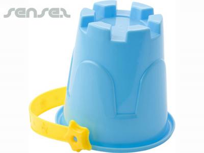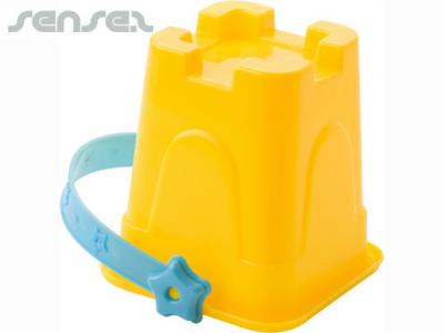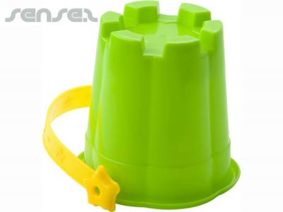 Custom print these fun plastic beach buckets in shapes of castles etc. The Beach buckets come in 4 different styles/colours. Two round ones, one square and one octagonal shaped. Each bucket contains mini tools: shovel, fork, scoop and sand strainer, two modeling parts in the shape of a fish and a crab.