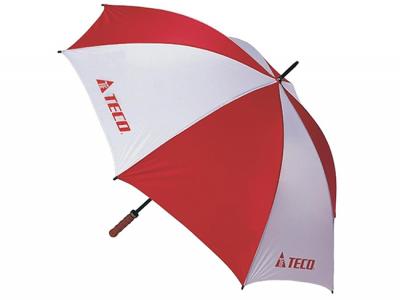 This is our very practical eight panel wind proof umbrella. The most affordable and reliable on the market. It comes with a tough metal frame, double ribs and turned wooden handle.