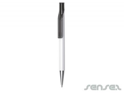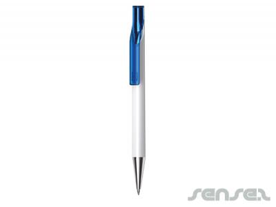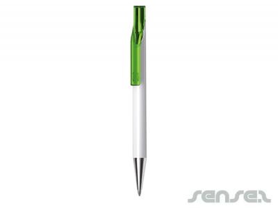 Our promotional Avoca Pens in white with colourful accent can be customized with your logo for great exposure. Corporate pens with logo branding can be used for any promotion! These sleek promo plastic ballpens with solid clip and barrel, chromed trim and tip come in a variety of vibrant colors to compliment your company logo: Black, Blue, Clear, Green, Orange, Red, Solid black and Solid white.