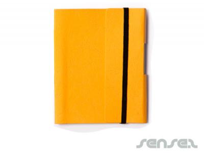 These note Pads come with a heavy flexible paper cover made from recycled paper and has 85 pages of recycled lined paper. The inside cover and each page has the recycled logo in the corner. Includes a blank black ink pen made from recycled paper. Also comes with an elastic band to keep the notebook closed.