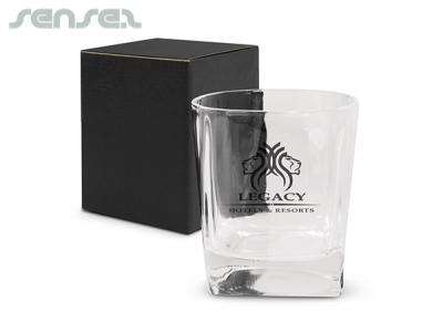 Stylish 250ml square base glass tumbler which can be presented in an optional black gift box (extra $1.20 each). The branding is dishwasher proof.