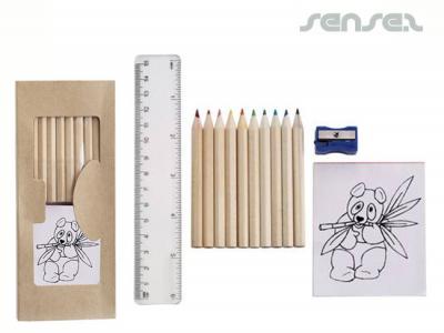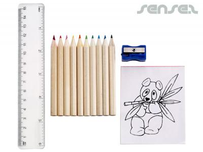 Consisting of ten coloured pencils, a 15cm ruler, sharpener and approximately twenty pictures for colouring.